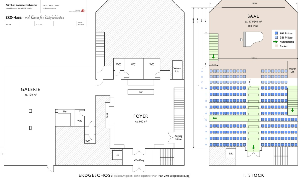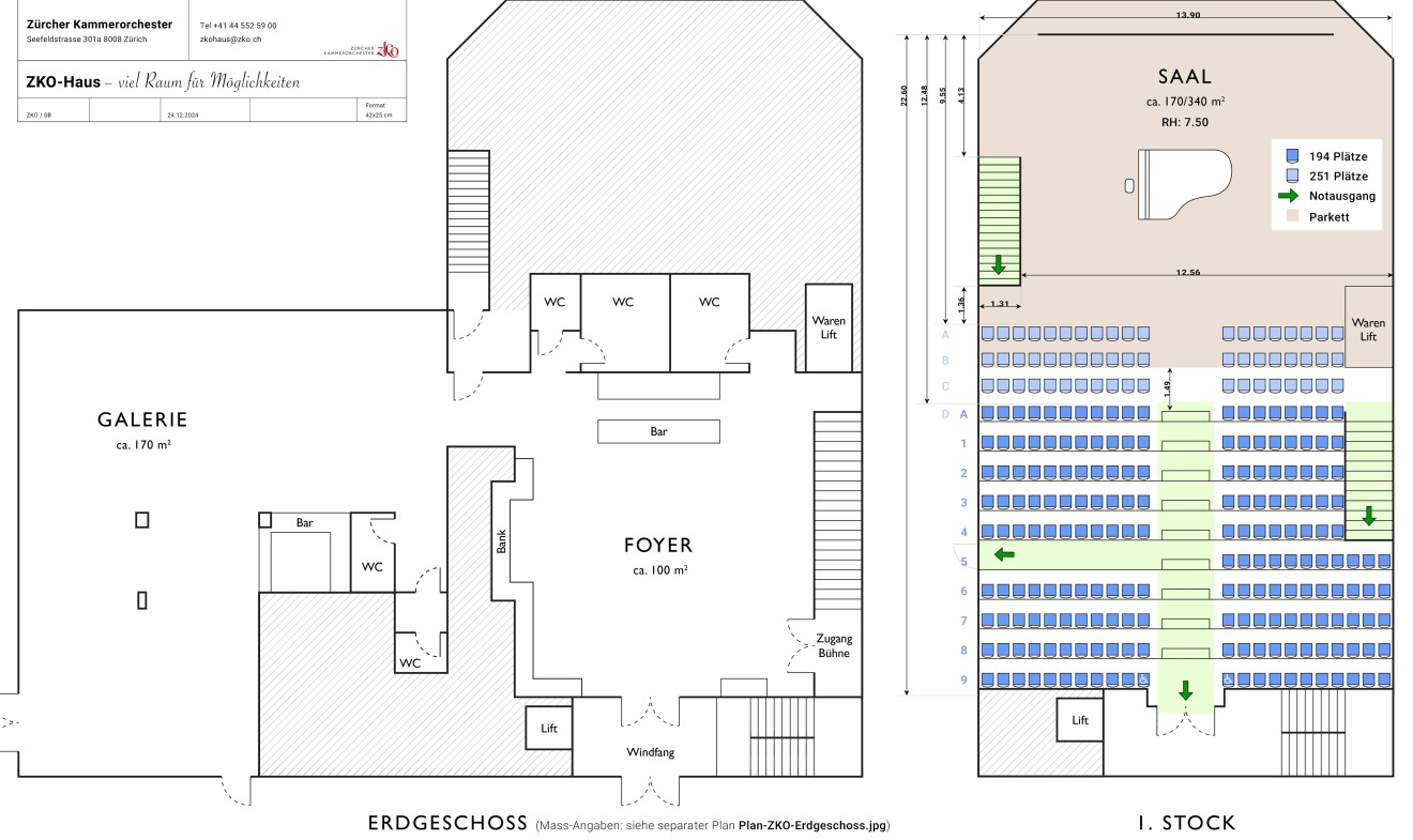 Mit einem musikalischen Programm im Konzertsaal und einem entspanntem kulinarischen Erlebnis im Foyer und der Galerie, kann das ganze Zuhause des Zürcher Kammerorchesters belebt werden. Zusammengeschlossen oder einzeln bieten sich das Foyer und die Galerie für eine Vielfalt von Catering-Anlässen und Gruppengrössen an. Das ZKO-Haus ist mit dem ÖV nur einige Minuten vom Zürich HB entfernt, somit sehr einfach erreichbar.