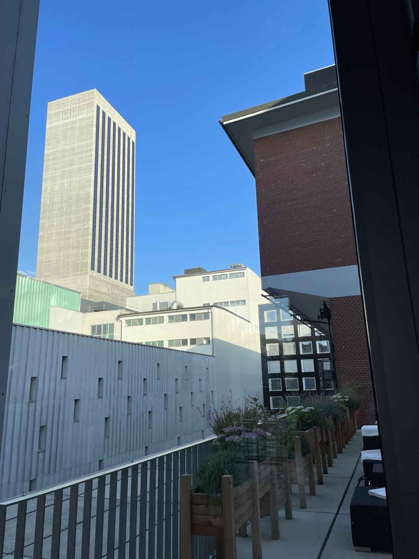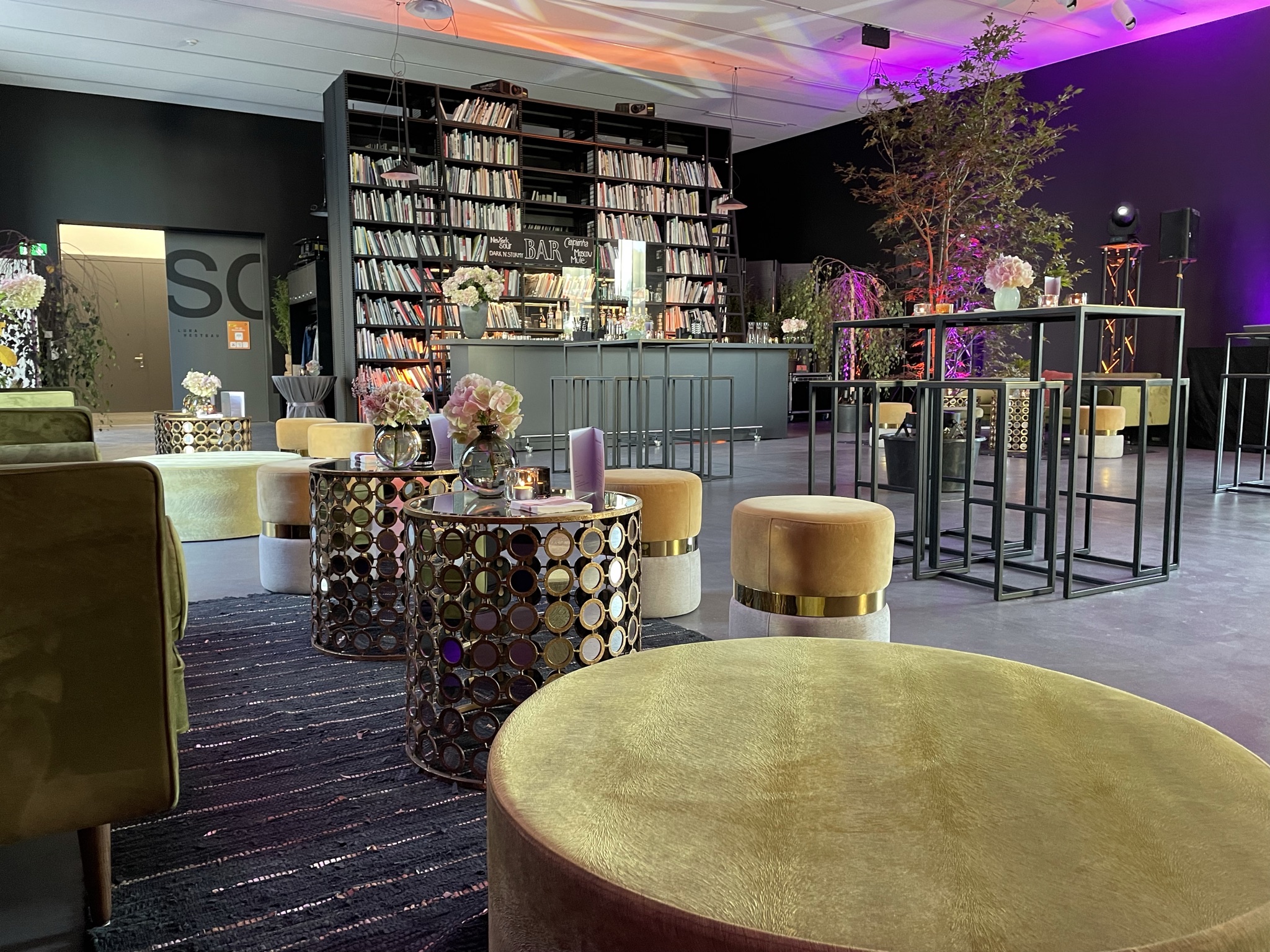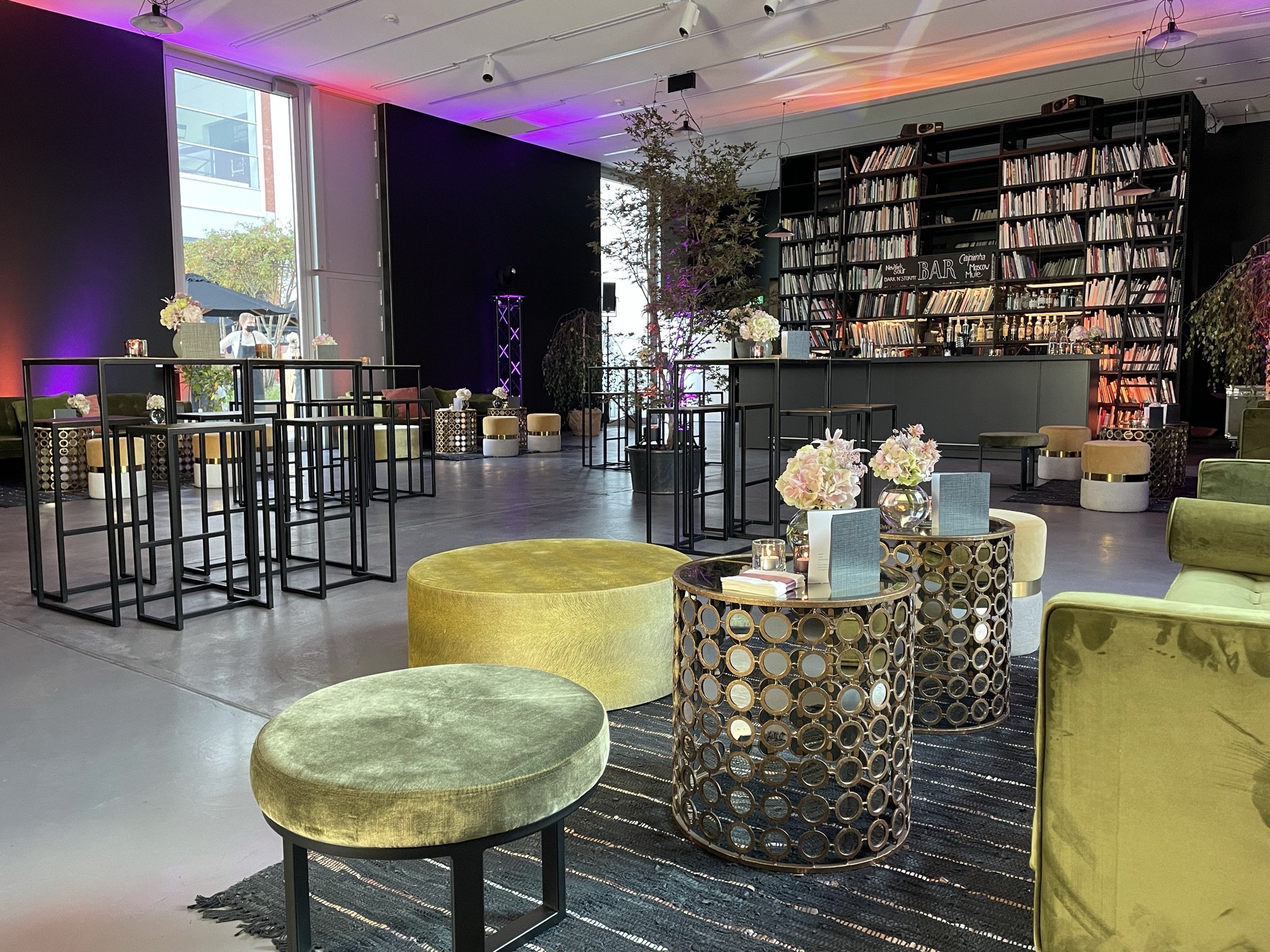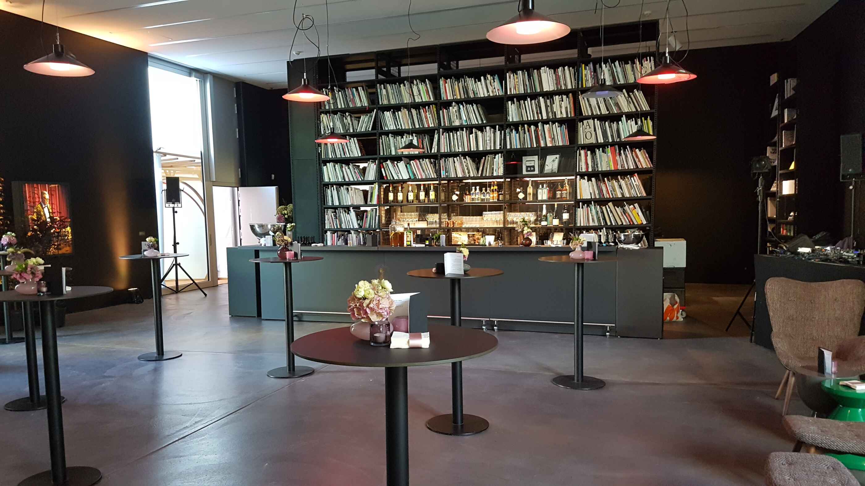 This space designed by the Austrian artist Heimo Zobernig is located in the Löwenbräukunst complex – the contemporary art center – in the heart of Zurich West. The spacious terrace with a view of the courtyard, the Swiss Mill Tower and the old factory chimney makes the industrial area immediately experienceable.